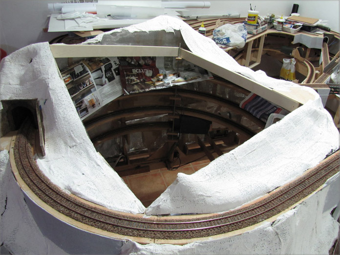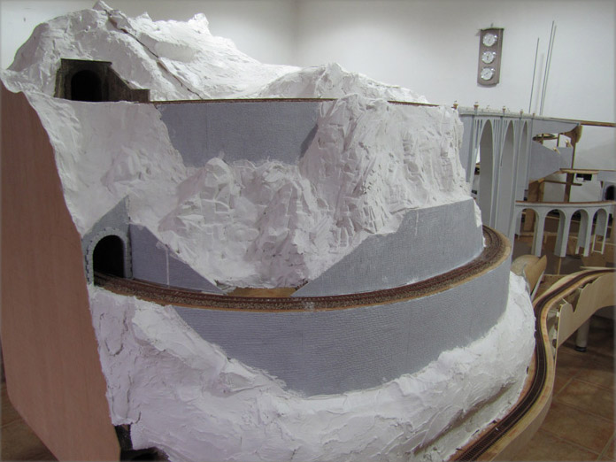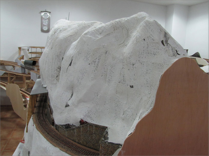 La cumbre de la montaña la he creado con una forma irregular. Se aprecia lo que será un camino rural que después de atravesar la vía se dirige a un rellano donde habrá una construcción. Se ve también la linea de separación de la «tapadera», que quedará disimulada con la pintura y la decoración.
